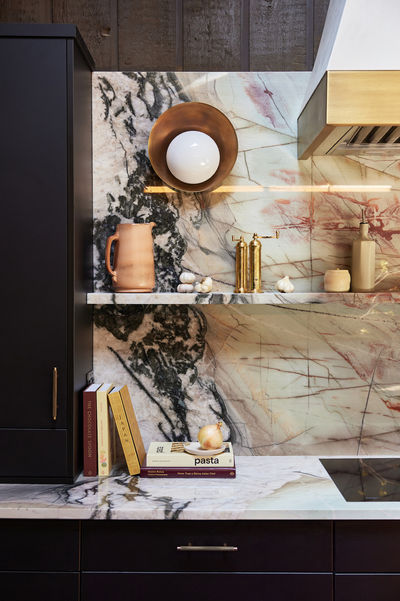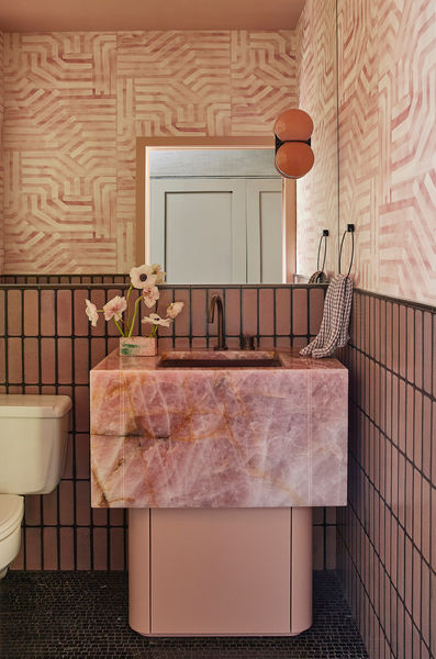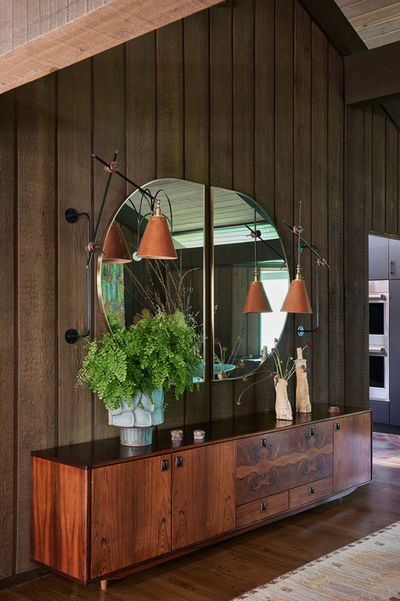 Honoring Erickson's vision was paramount in bringing the home into the present. Brick paver floors were diamond sanded back to their original coloring and the distinct cedar wall paneling was preserved, complementing the low-pitched roofline throughout. Copper fireplace hoods, seen in both the foyer and great room, remained untouched, serving as striking accents to the space's architectural artistry. Some of Bishop Studio's exceptional design additions include Japanese-inspired kitchen materials, a custom-built dining table seating eighteen, and an Adrian Pearsall semi-circle sectional in its original pink upholstery.