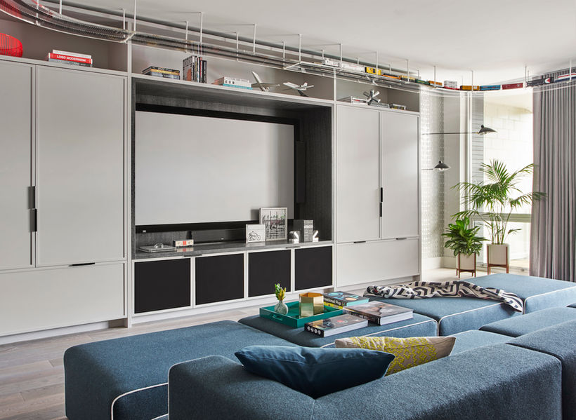 An enthusiastic uncle fond of hosting large family parties sought to build a bachelor pad fit for kids to play in Chicago’s Wicker Park neighborhood. Formerly two units, this reimagined triplex was equipped with a custom treehouse clad in reclaimed cedar while an electric train was installed to navigate the ceiling perimeter. Chic but durable textiles were chosen for the furnishings, ensuring functional but sophisticated spaces for adults and children alike.